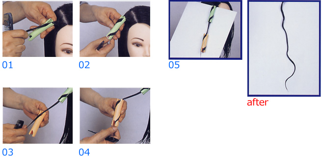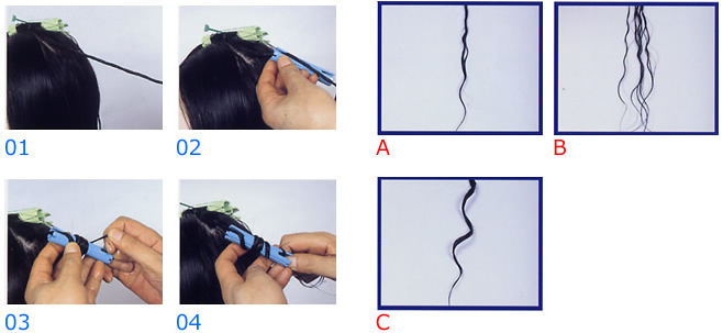 04:ウェーブを欲しくない毛先をX溝に入れ逃がします。